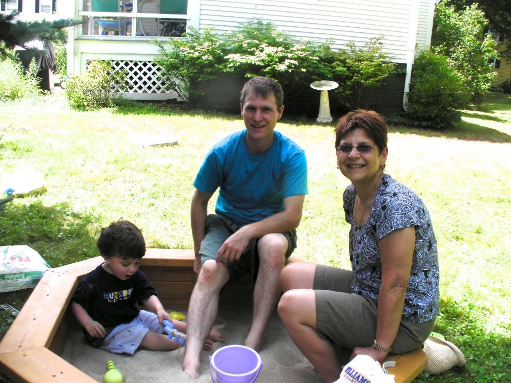 Uncle Brian also came to visit in July. We had a great week with him. He and Geema built Seth a sandbox! Uncle Brian had been planning to do this as Seth's second birthday present, and he made a wonderful sandbox! Seth thought it was lots of fun to watch and "help" Uncle Brian with the sandbox, and he was delighted with the finished product. We all went for a few days to stay at a beach-side condo in Misquamicut, RI, which was lots of fun.
