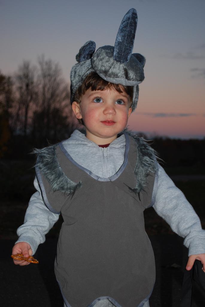 This fall, I've started taking Seth to story hour at the public library, in addition to Music Together, and we've been doing a little swimming with him. We had fun with all the fall activities. We went on a nice apple and raspberry picking outing, and went pumpkin picking with Grams. We had so much fun pumpkin picking - we took Seth on his first hayride, and he loves hay! Seth was a rhino for Halloween (his own costume choice), though the poor little guy was suffering through his first case of croup during that weekend. He was a trooper, and he is finally feeling better.