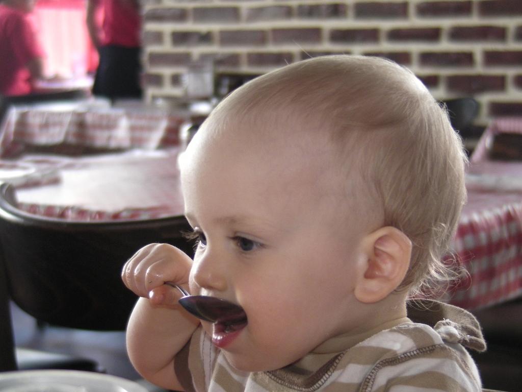 - Evan is still really enjoying feeding himself, using a spoon and taking bit bites of things.