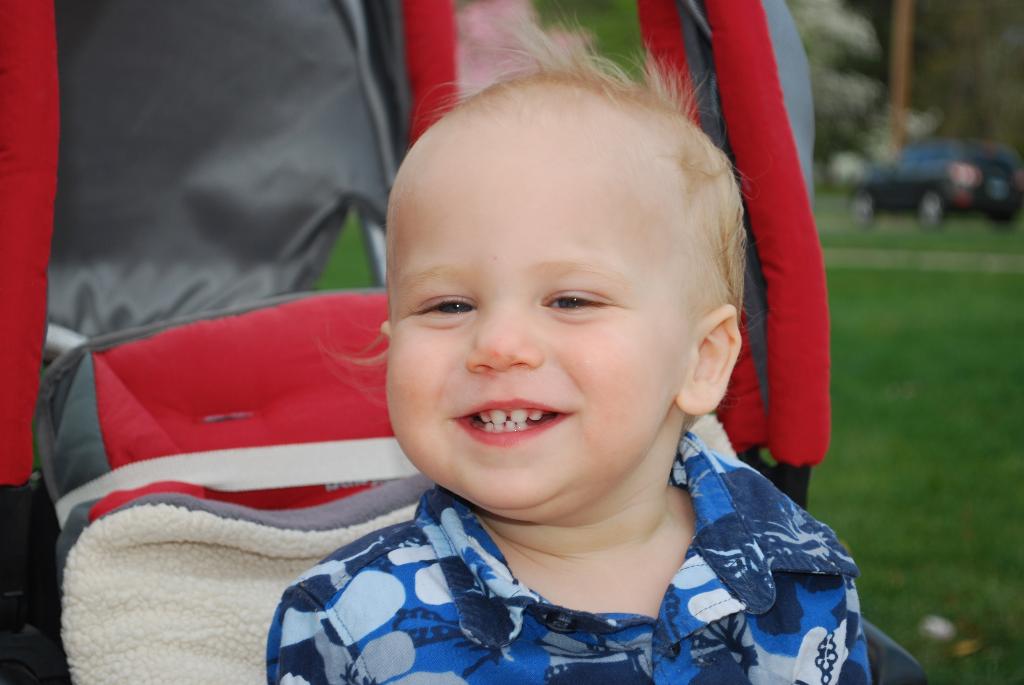 - He is still a little blondie - he has a lot of curls in the back, and he gets a little sweaty head in the summer. He won't keep his hat on!