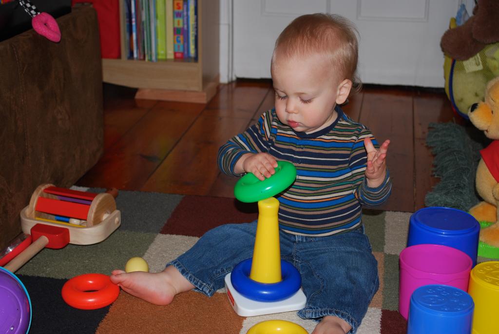 - Though Evan is always on the go, he can sit for a few minutes and entertain himself with rings, blocks, etc. We take any chance we get to sit for a couple minutes!