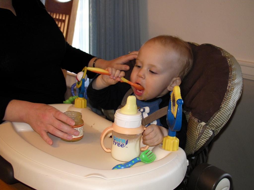 - Evan likes to feed himself. It is funny - he will pick food up with his hand and then place it on his spoon.
