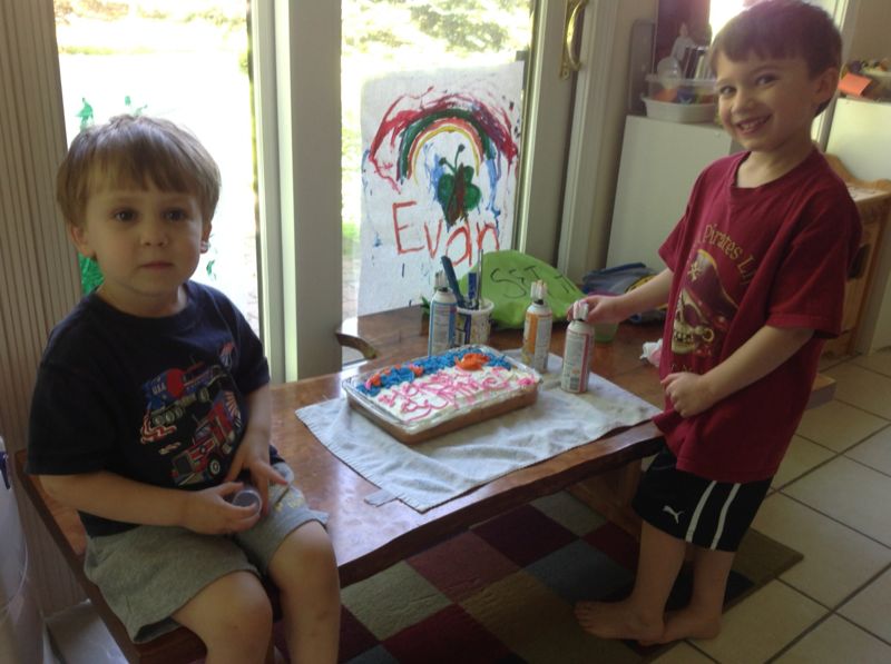 When Liz arrived, I started my new summer exercise routine. I couldn't live any closer to the track - right across the street. While Liz finished up breakfast with the kiddos, I went out and ran a mile - four times around the track! This will be the summer of getting back in shape. Then, time to shower! Did some laundry. Babies down for a nap. Evan stayed with Liz, and I took Seth for some one-on-one time to the grocery store. Got groceries for the week, and we had a project today - making a "happy summer" cake. Seth helped me pick out the cake mix (marble), the frosting (vanilla), and colors for the decorations (pink, blue, and orange). Back home, and the babies woke up from their nap and played with Liz while they boys and I mixed the cake and got it in the oven.
