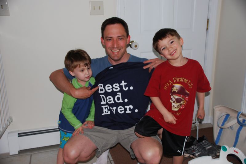 The boys greeted Daddy excitedly before he could remove his shoes, and he was just as happy to get his presents today as he would have been yesterday. Highlights included a book called Darth Vader and Son, by Jeffrey Brown, and a t-shirt that says "Best Dad Ever."