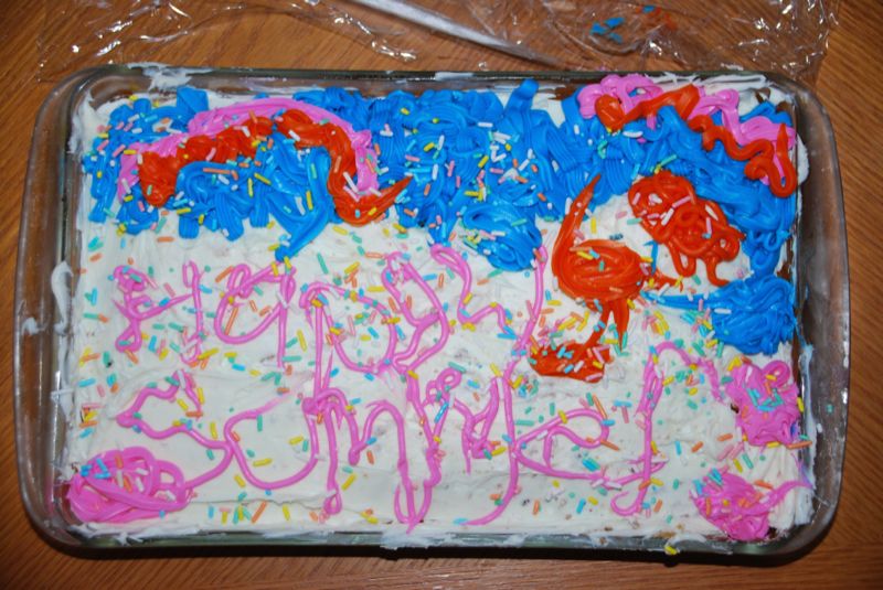 Daddy took Evan to the pool to work on his swimming skills - Seth will get to go tomorrow. I stayed home with the other kiddos and got dinner ready. Had a yummy dinner, and then the eating of the much-anticipated Happy Summer Cake.