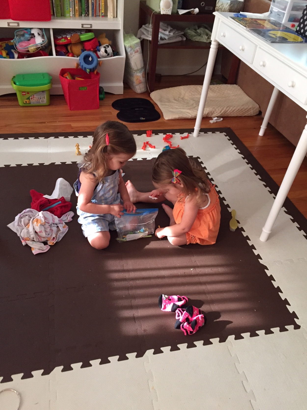After breakfast this morning the girls chose barrettes for their hairstyles. Here they are using teamwork to put back all the barrettes they dumped out back into the bag.