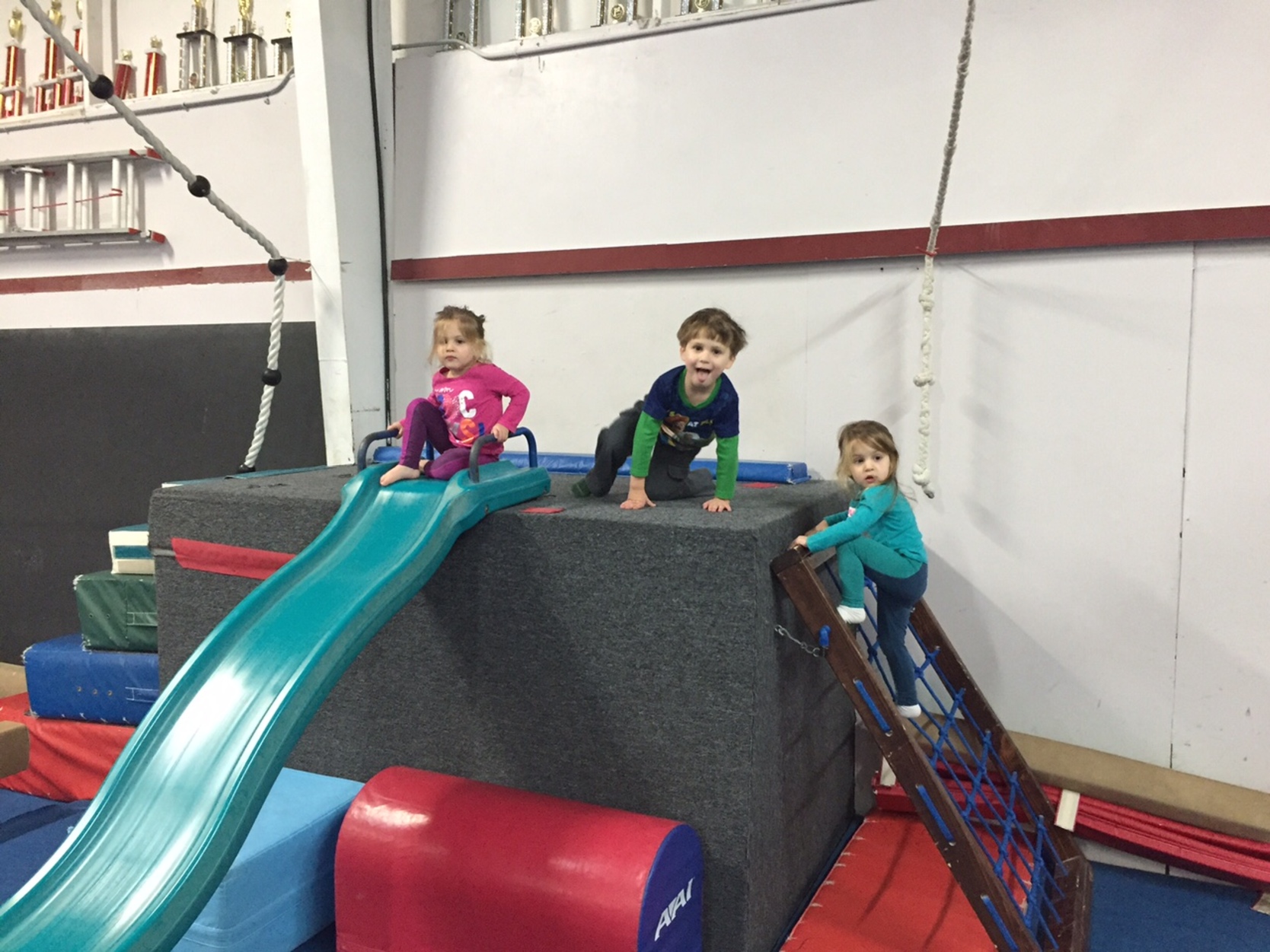 As Evan, Nora, and Maya were not in school that day, Jason took the morning off and brought the youngest three out on an adventure while I was at school with Seth. First he took the kids to the Agawam Public Library, followed by a trip to open gym at Whip City Gymnastics, a never-before-attempted feat. Lo-and-behold, the girls were at the perfect age for this unstructured playtime, and all the kids had fun.